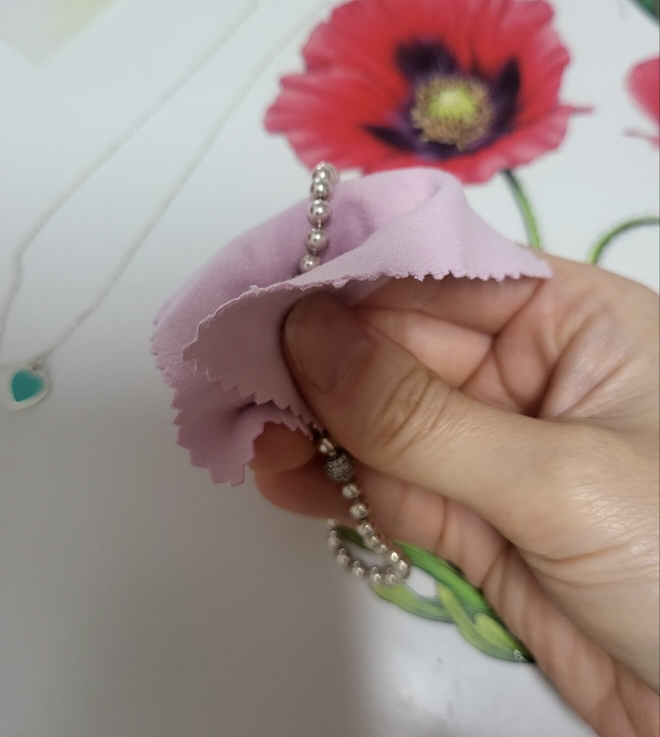 먼저 은세척용 천을 준비합니다. 이 제품은 언듯 보면 안경닦이용 천 같아 보이지만 천에 광을 내기 위한 물질이 추가되어 있다고 합니다. 안경알 닦으시면 곤란합니다^^; 평소 이 천으로 자주 광을 내주시면 은제품의 광택을 잃지 않고 잘 착용하실 수도 있습니다. 하지만 우리들 그렇게까지 부지런하지 못 한 듯합니다....ㅎㅎ