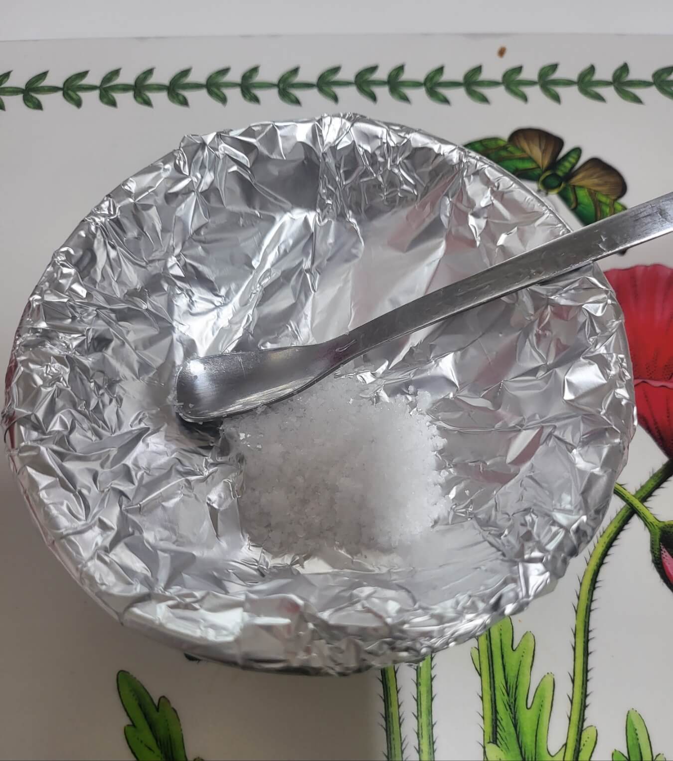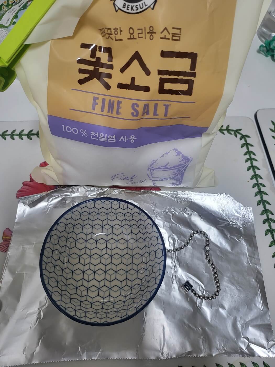 아무 종류의 소금, 작은 종지, 쿠킹 호일, 뜨거운 물