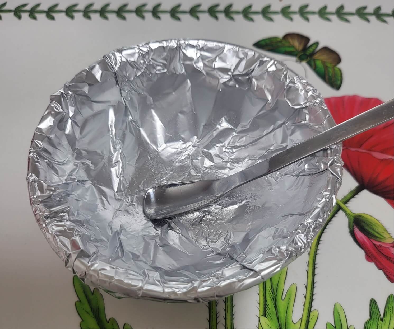 - 쿠킹 호일이 찢어지지 않도록 주의하며 작은 종지를 잘 감싸줍니다.