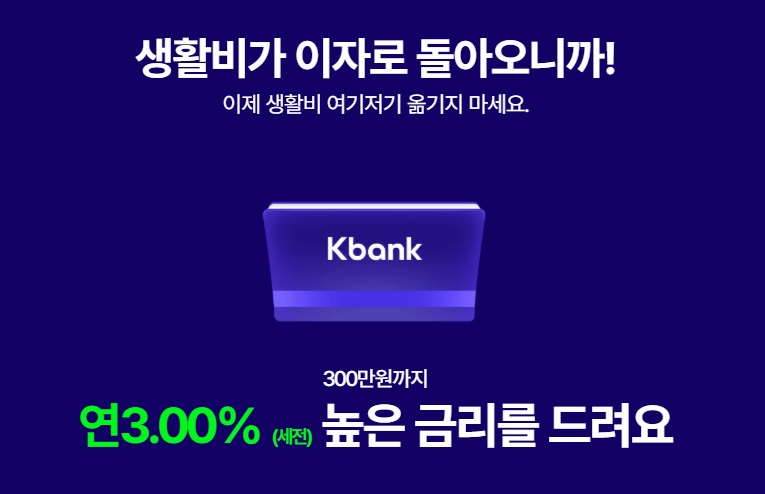 요즘같은 저금리 시대에 이율이 좋은 생활비 통장이 케이뱅크에서 나왔습니다. 바로 [케이뱅크 생활비통장]입니다.