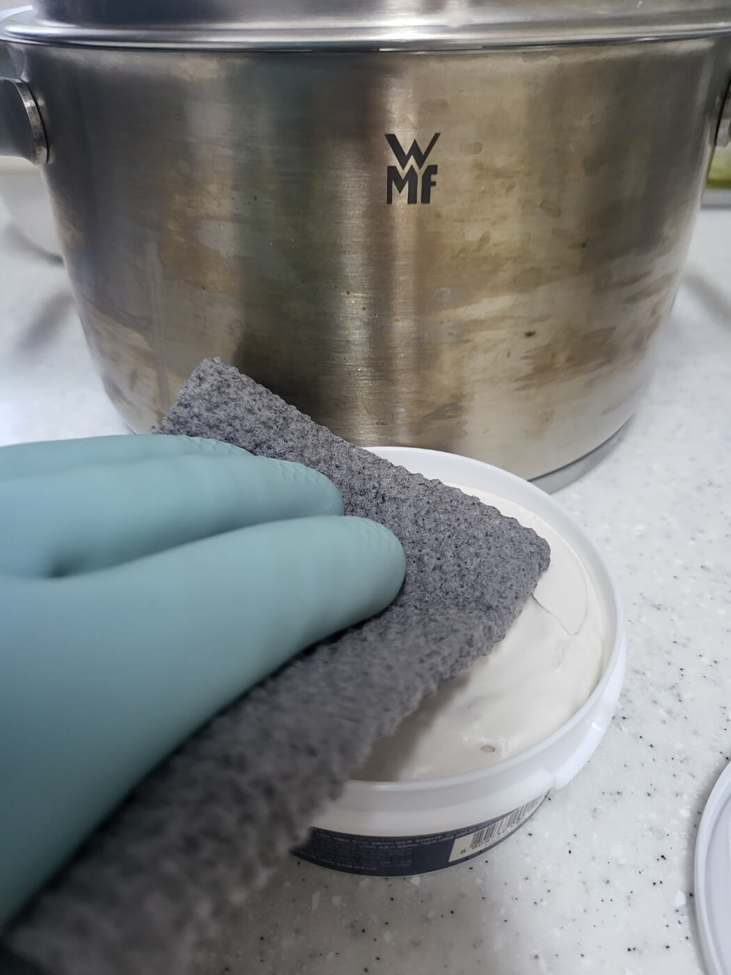 세척 전 냄비 상태입니다. 딱 봐도 얼룩이 심한 상태입니다. 안내된 사용법처럼 냄비에 다이소 스텐 크리너를 골고루 펴 발라줍니다. 그런 후 수세미로 빡빡 문질러 주며 얼룩을 제거하고 미온수로 헹군 후 주방세제로 한번 더 깨끗하게 씻어주었습니다. 과연 다이소 스텐 크리너가 스탠얼룩 제거에 드라마틱한 효과가 있을까요?