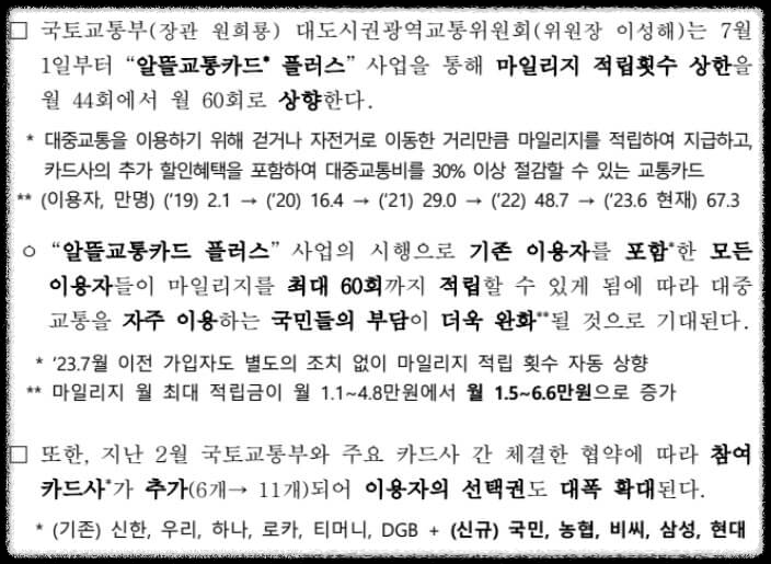 국토교통부는 지난 7월 1일부터 "알뜰교통카드 플러스" 사업을 통해 기존 알뜰교통카드 사업에 교통비 혜택을 플러스하였습니다.