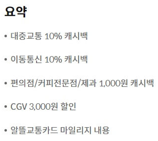 대부분의 카드가 전월 실적 제한이 있는 반면 Kbank MY체크카드 알뜰교통플러스 카드는 전월 실적 제한이 없어 사용하기 부담이 없어 보입니다.