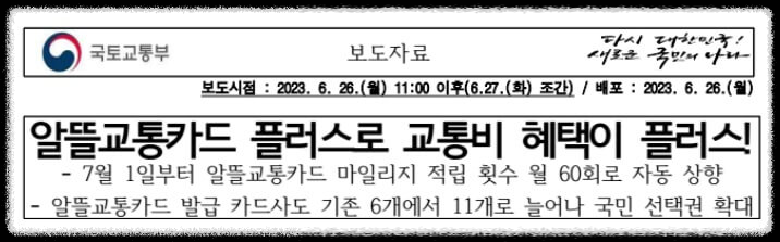 국토교통부는 지난 7월 1일부터 "알뜰교통카드 플러스" 사업을 통해 기존 알뜰교통카드 사업에 교통비 혜택을 플러스하였습니다.