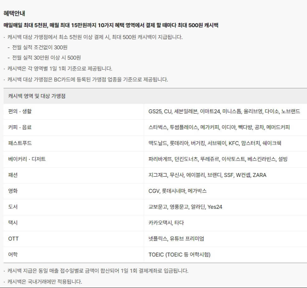 전월 실적이 30만 원 이상 시에는 500원 캐시백 되고 매일 최대 5천 원, 매월 최대 15만 원까지 혜택 받습니다.