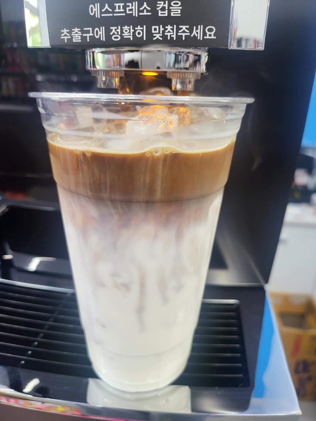 얼음컵에 우유를 먼저 따르고 커피머신으로 가 에스프레소 버튼을 누른다. L사이즈라 에스프레소를 두 번 받으면 된다.