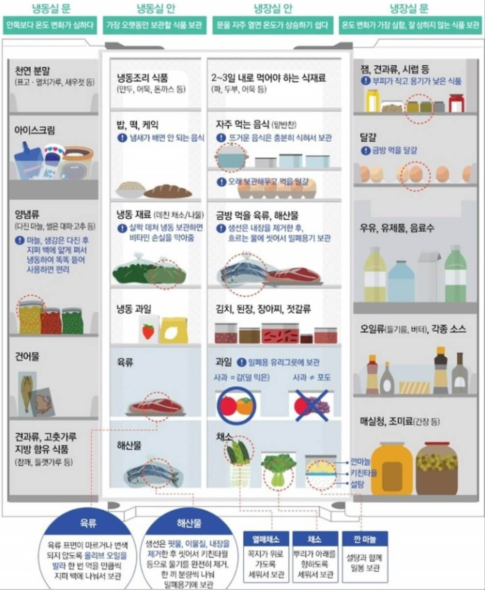 - 냉장실 안 : 곧 먹을 식재료 / 밑반찬, 육류, 해산물 / 김치, 장아찌, 젓갈류, 된장 / 과일 / 채소 등의 순서로 정리