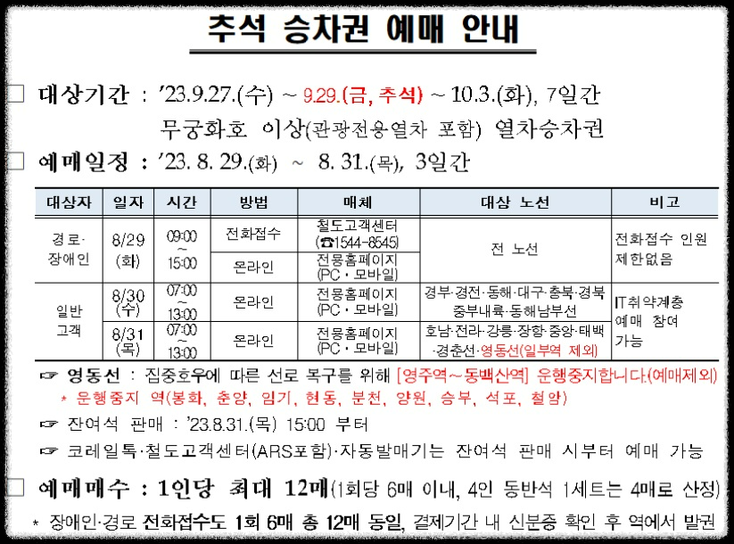 추석 승차권 예매 안내 - 8월 29일(화) 9:00~15:00 장애인, 경로 - 8월 30일(수) 7:00~13:00 경부선, 경전선, 동해선(포항) 등 - 8월 31일(목) 7:00~13:00 호남선, 전라선, 강릉선, 중앙선 등