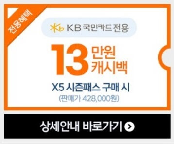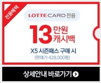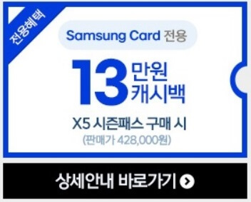국민카드, 롯데카드, 삼성카드 3사 신규 발급 후 해당 카드로 X5 시즌패스 구매 시 13만 원 캐시백 됩니다.