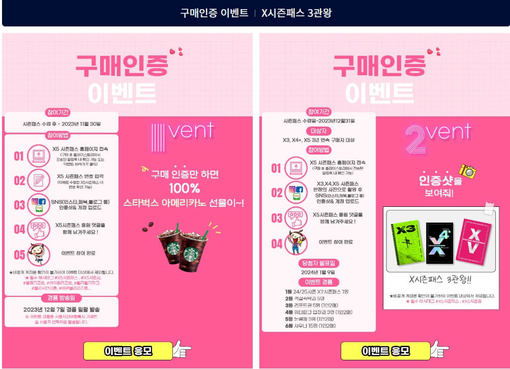또한 X5 시즌패스 23/24 스키 시즌권을 구매한 고객들을 대상으로 2가지의 구매인증 이벤트도 진행하고 있습니다.