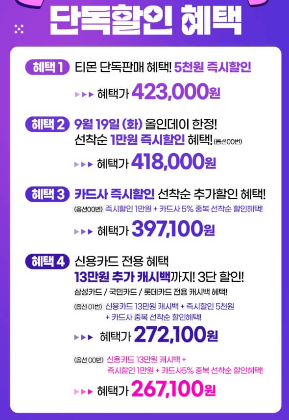 **유의사항 - 즉시할인 및 카드사 중복 할인혜택의 경우 예산 소진 시 조기마감 될 수 있습니다.